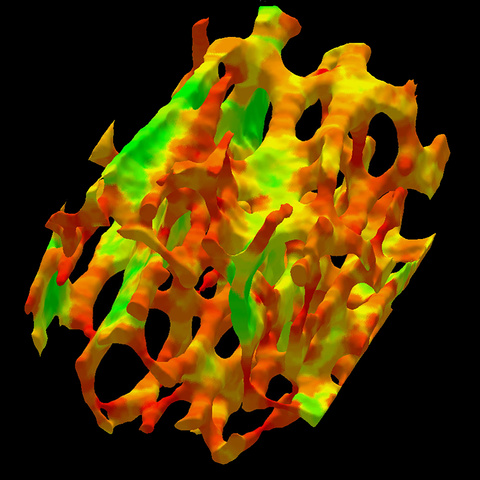 Osteoporosis is a common and debilitating condition of aging. Treatments are most effective in the early stages of the disease. Therefore, identifying early bone loss is a key to slowing and/or stopping disease progression. Bone loss begins in the trabecular or “spongy” bone, which is found at the ends of the cortical bones that provide structural support for the body. This image shows the plates (green) and rods (red) of human trabecular bone at the distal tibia. Histologic evidence confirms the relationship between the gradual conversion of trabecular plates to rods and increased fracture risk. The Saha Lab developed a computational method that identifies these structures more distinctly than other imaging options. The unique algorithm characterizes individual trabecular bone on the continuum between a perfect plate (green) and perfect rod (red), enabling early detection of imbalance between trabecular bone plates and rods and thus, increased risk for fracture.