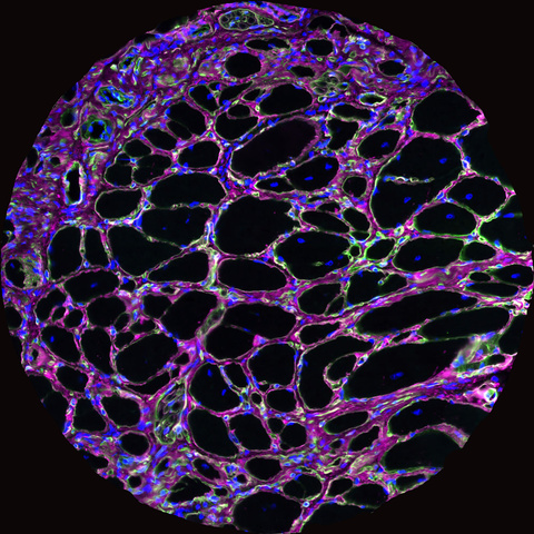 This is an image of mouse muscle that has undergone immunofluorescent stain, which produces the bright colors. Immunofluorescent staining helps scientists determine whether particular proteins are present in the tissue. In this image, proteins are stained to highlight muscle fibers and fibrous tissue, which allows researchers to measure the diameter of the fibers and amount of fibrous tissue. These are indicators of muscle health--small fibers and high fibrous content indicates weakened muscle. The Campbell Lab has been working for more than two decades to identify the mechanisms that cause muscular dystrophy and to develop therapies for these diseases.